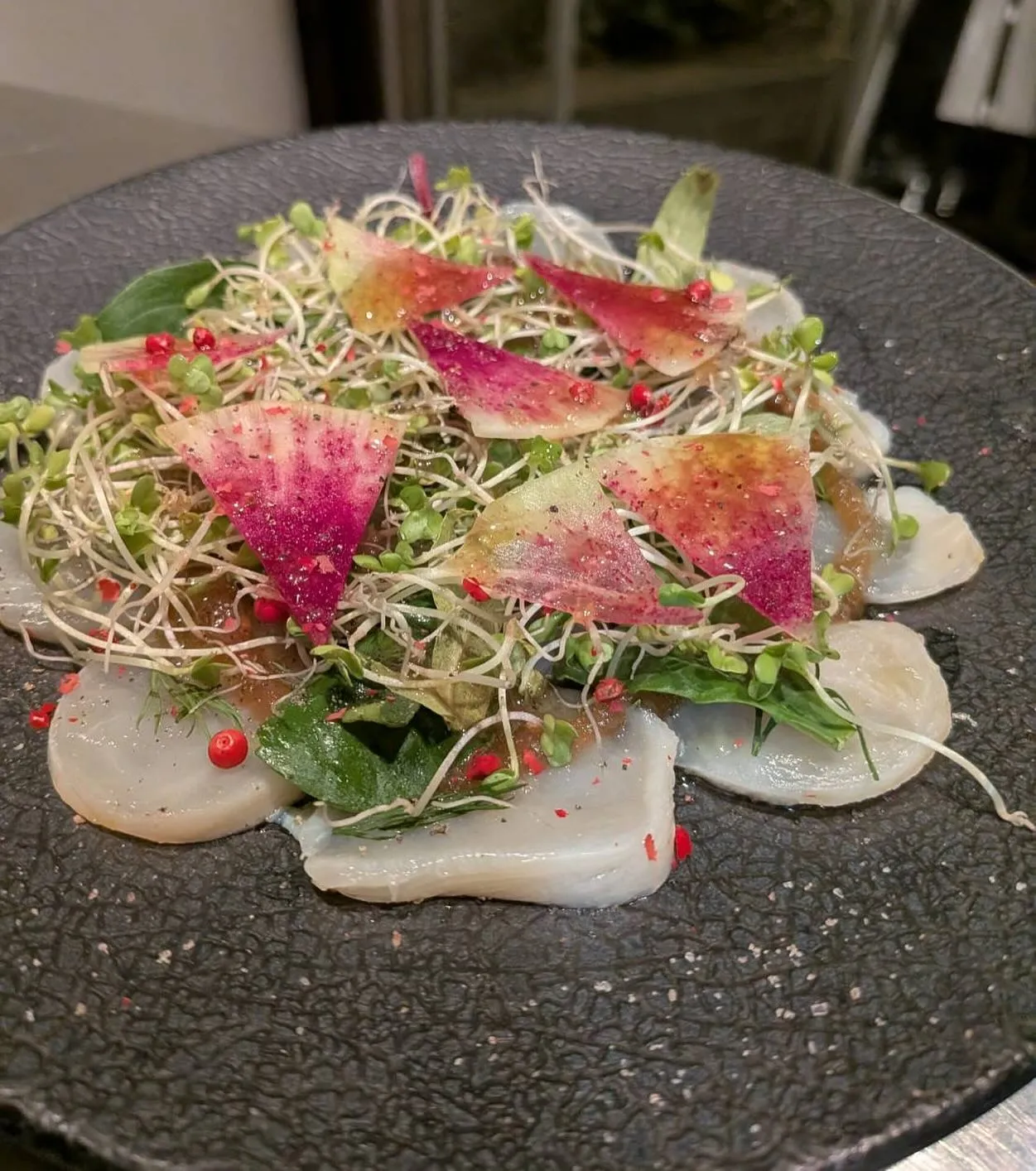 新鮮な平貝とパクチーのカルパッチョ、春の訪れを感じさせる一品...