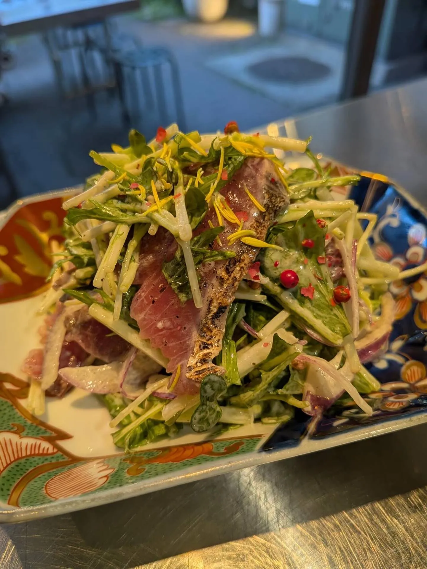 新メニュー、「鰹のガーリックマヨ」がおすすめです。皮目を炙った鰹を風味豊かなガーリックマヨで仕上げ、サラダ仕立てにしました。おつまみとしてもぴったりで、特に当店自慢のクラフトジンのソーダ割りと絶妙な相性を楽しんでいただけます。この一皿で、忙しい一日の疲れを癒し、暖かい春の日を感じさせるお食事をお楽しみください。